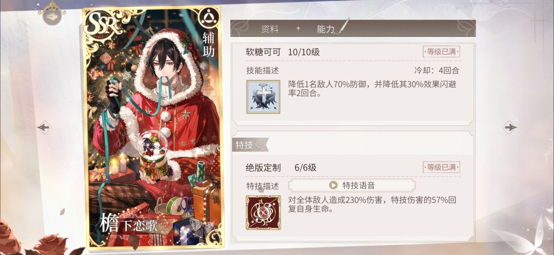 【】 【】同款强力辅助技能,可跟此卡和另一张群充卡组速充娱乐队,SP条嘎嘎涨~ 特技是吸血版【】。但对敌方的扣血低到≈0,满特拉满自身吸血仅5625,跟目前其他3张吸血SSR不在一个档次,勉强搭配2技能护盾加强自身站场能力。 【】 【】、【】同款强力自充增伤技,让他们有了进编队的资本。 这类SR+满特后战力碾压1特SSR,且颜料资源花费较少,对满特SSR也不遑多让。 缺卡、想组艾因队、想抽辅助卡的