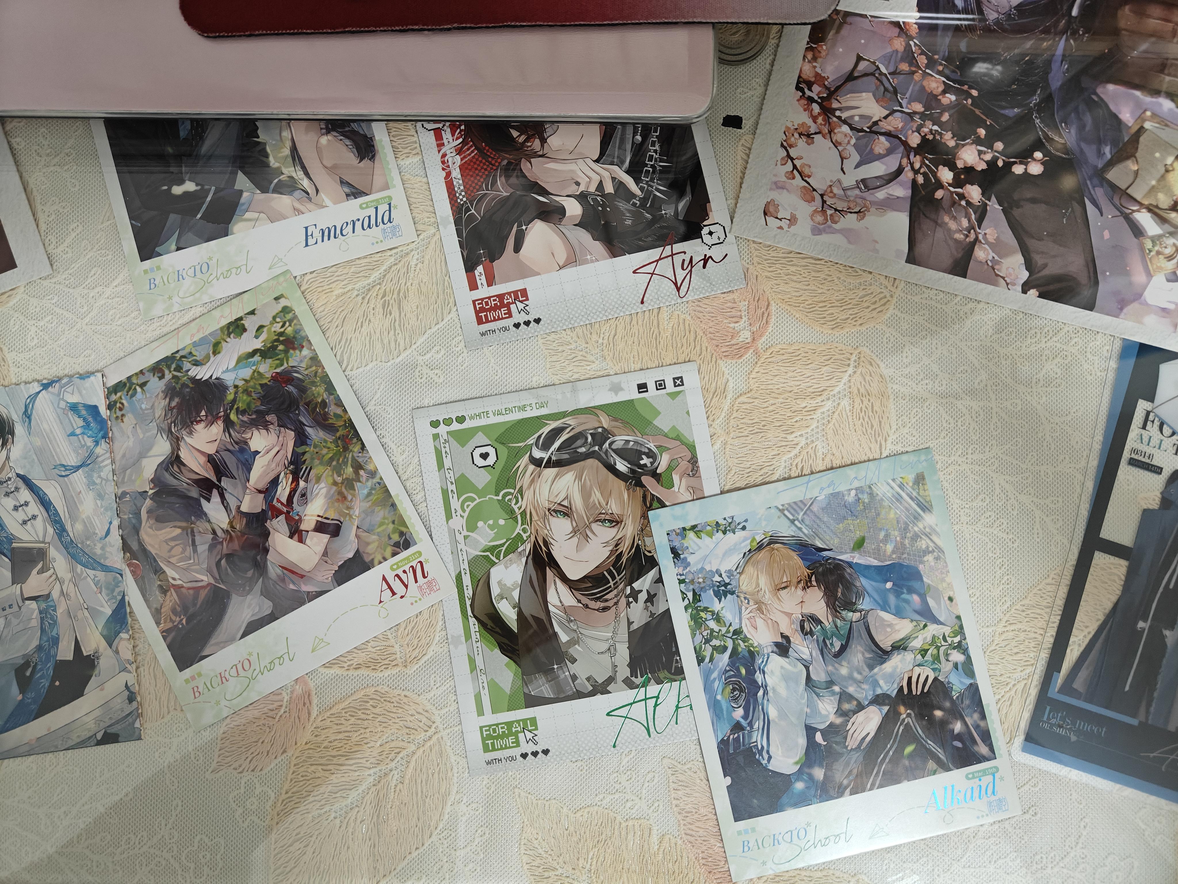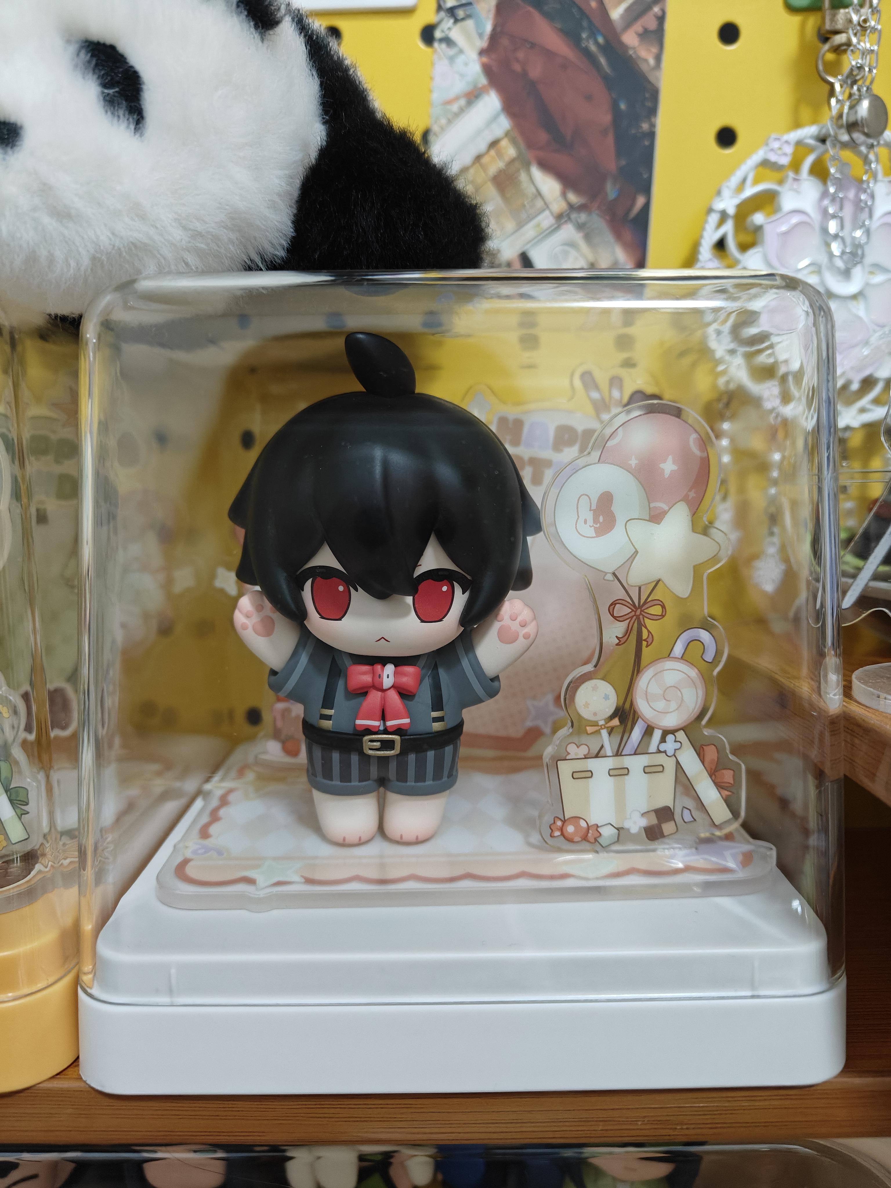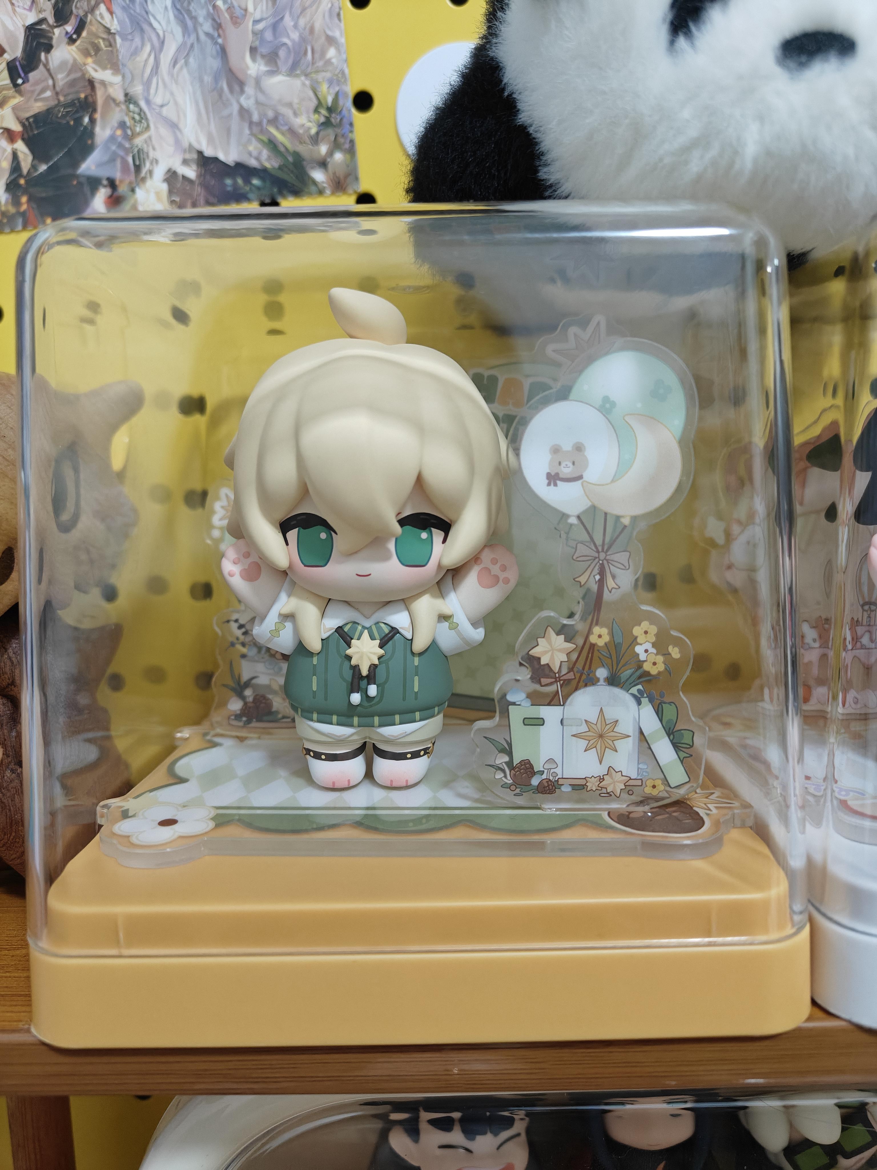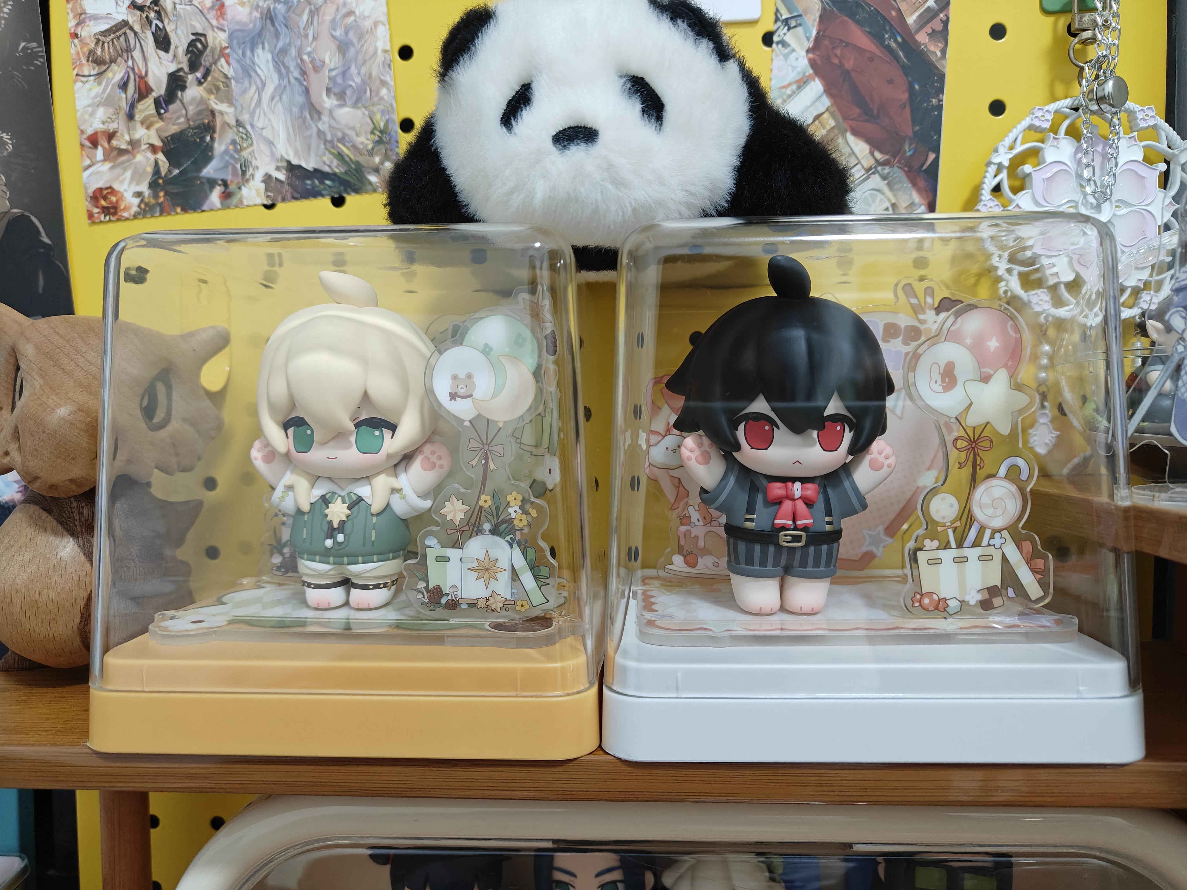 这个生日系列的摆件,真的好萌!!当初一看到就想到要买个防尘罩装起来,天天看!除此之外,马克笔、日历(2026年日历那批周边错过了,没买到)、画轴、帆布袋,也都很喜欢。由此可见,我挺注重实用性、观赏性的,哈哈哈哈哈!至于纸质类,比如拍立得,我就把桌面布置了一下,买了桌布,在定制了一块玻璃,把卡片放到玻璃下,技能保护好卡片又能观赏。而徽章,目前没有位置放置出来。后面再想想办法。