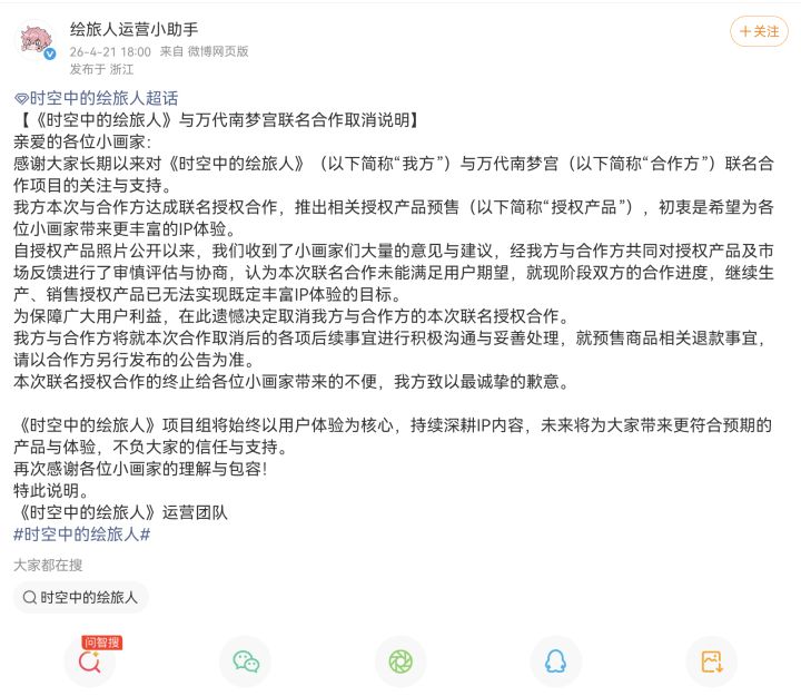 《时空中的绘旅人》与万代南梦宫的联名合作,还没等正式开卖就黄了。项目组昨天晚上发布说明,称双方共同评估后认为这批授权产品的品质没能达到玩家预期,继续生产和销售已经没法实现“丰富IP体验”的初衷,所以干脆整个取消(如图二,图三)。从字面意思看,这个决定是为了保护用户利益,但仔细琢磨,产品照片都公开了,预售也开了,抢到的小画家们也付款了,这时候才说“不符合期望”,那前期的审核环节到底干了什么?评论区