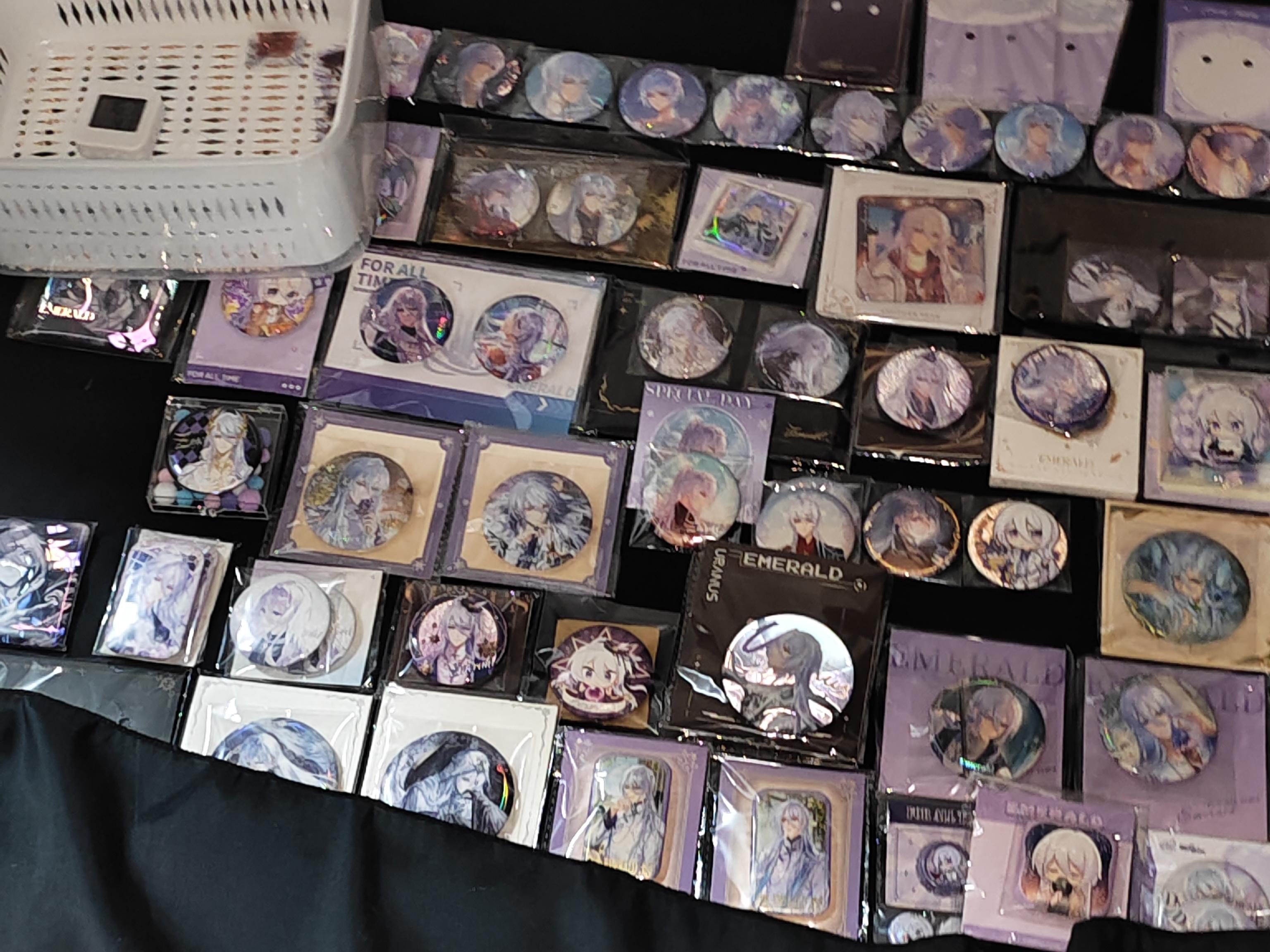 这个生日系列的摆件,真的好萌!!当初一看到就想到要买个防尘罩装起来,天天看!除此之外,马克杯、日历(2026年日历那批周边错过了,没买到)、画轴、帆布袋,也都很喜欢。由此可见,我挺注重实用性、观赏性的,哈哈哈哈哈!至于纸质类,比如拍立得,我就把桌面布置了一下,买了桌布,在定制了一块玻璃,把卡片放到玻璃下,既能保护好卡片又能观赏。而徽章,目前没有位置放置出来。后面再想想办法。