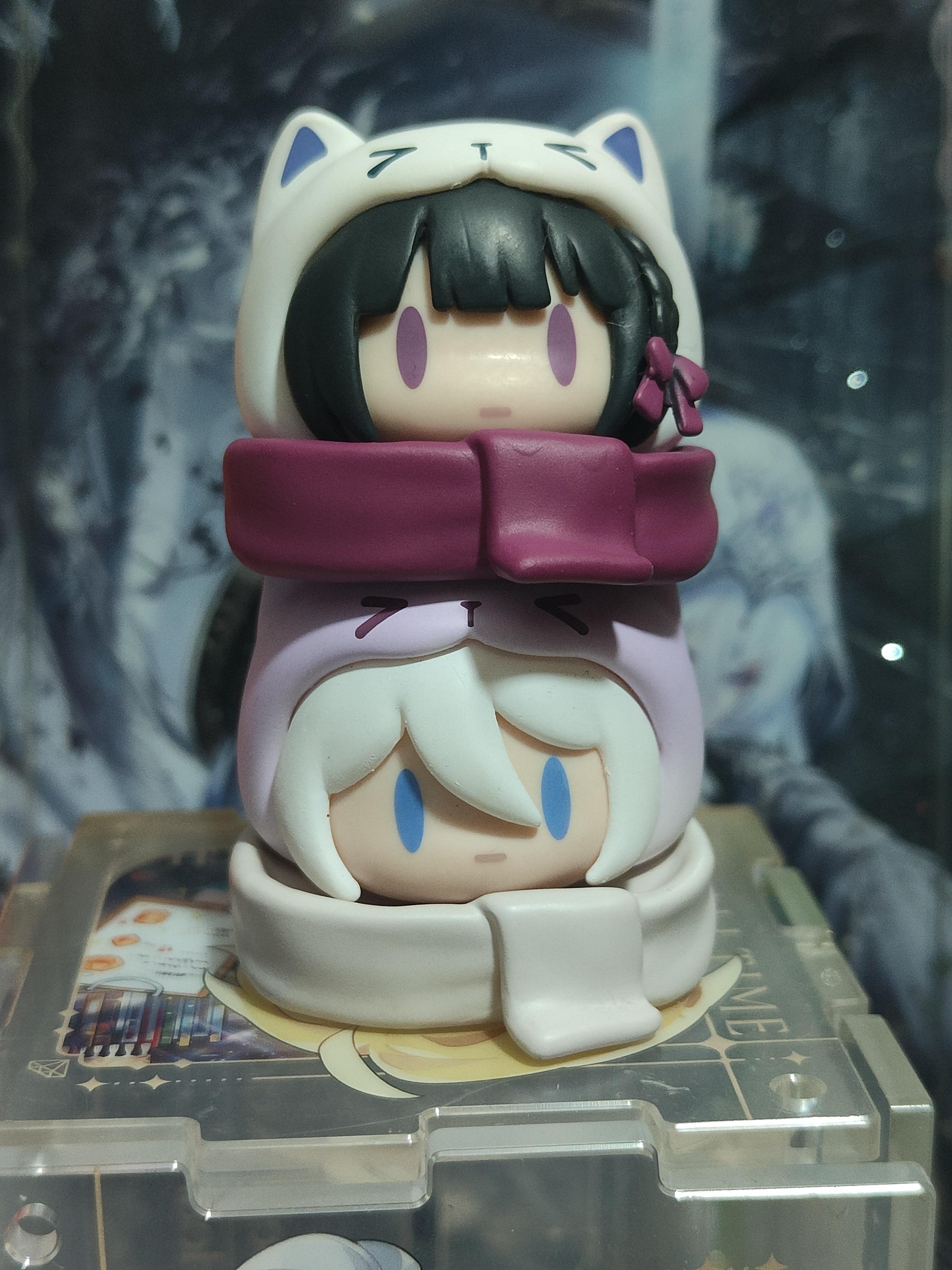 这个生日系列的摆件,真的好萌!!当初一看到就想到要买个防尘罩装起来,天天看!除此之外,马克笔、日历(2026年日历那批周边错过了,没买到)、画轴、帆布袋,也都很喜欢。由此可见,我挺注重实用性、观赏性的,哈哈哈哈哈!至于纸质类,比如拍立得,我就把桌面布置了一下,买了桌布,在定制了一块玻璃,把卡片放到玻璃下,既能保护好卡片又能观赏。而徽章,目前没有位置放置出来。后面再想想办法。