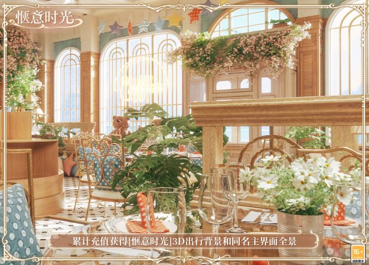 「风和日暖,惬意时光。」★在[圣塞西尔公主节II]中,可获取通用3D场景[惬意时光]。作为[出行场景]使用视为典藏场景,具备陀螺仪功能,其他功能与常规场景相同。作为[主界面全景]使用可进行更多视角旋转,若拥有公主节3D玩偶纪念品可放置其中。★获取介绍:限时充值积分达到1880可同时获得[惬意时光]的出行背景和主界面全景双版本。在限时充值中,最多可获得[老荷兰颜料]*20和[觉悟]*10。*