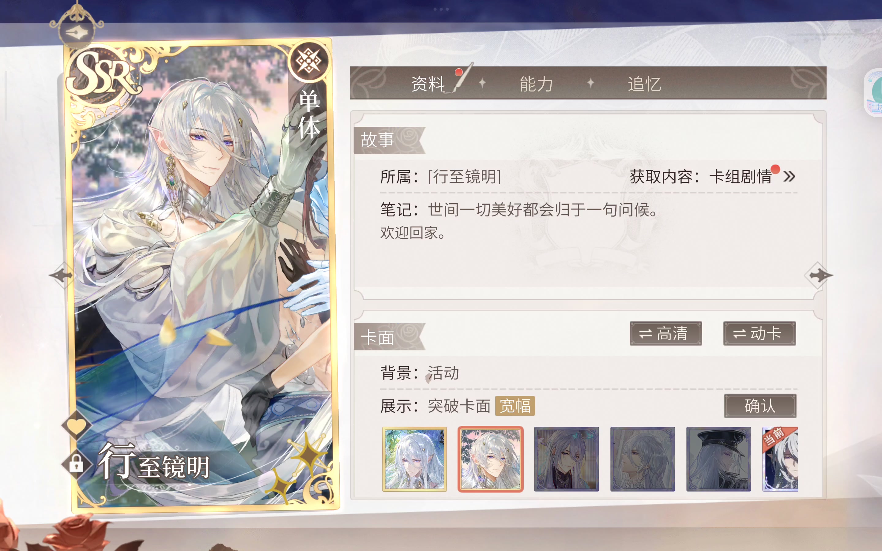 不愧是我花了整整21元充出来的卡,好美,有12是买第二个个视频里的异色了(p5),真的好好看,属于买了不后悔,不买后悔一辈子 然后是周年的自选常驻卡和活动的路辰卡,一个周年总共出了3张SSR,好诶!/喝彩 活动还拿了两个新的开屏 在考虑要不要再抽20抽拿一个q版皮肤,如果要的话还要肝10抽,随缘吧,还差一个SR的叶瑄卡没拿,大概明天就能有 之后就是等过年给叶瑄过生日了,期待生日卡 总之就算这个周年