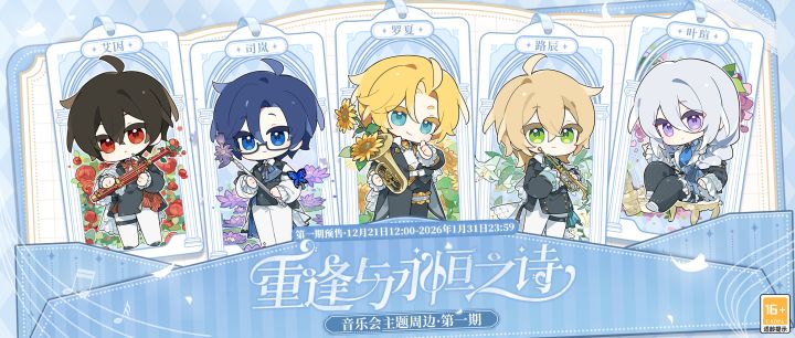 店铺:KAKACODE 淘宝店贩售时间:2025年12月21日12:00-2026年1月31日23:59★预售产品:「重逢与永恒之诗」系列·第一期:纪念票、印象唱片、线稿明信片、Q版应援棒、拍立得套组、交响乐团毛绒娃娃、Q版方形马口铁徽章、Q版彩窗亚克力杯垫、Q版打卡棒、毛绒吱吱挂件、Q版金属徽章、线稿帆布袋、“这才是真正的音乐”马口铁徽章。★预售期间,凡购买「重逢与永恒之诗」系列·第一期