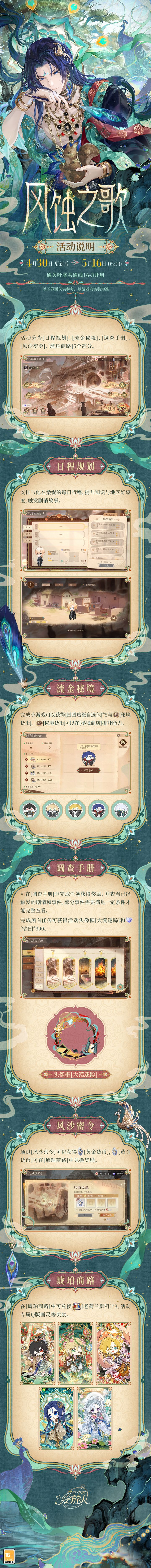 ⭐开启时间:4月30日更新后 - 5月16日05:00,通过[主界面]-[花架]进入[风蚀之歌]。⭐活动玩法:活动分为[日程规划]、[流金秘境]、[调查手册]、[风沙密令]、[琥珀商路]5个部分。►[日程规划]:安排与他在桑缇的每日行程,触发剧情故事。►[流金秘境]:和他一起在沙漠寻宝,获取[秘境货币]以强化寻宝能力。►[调查手册]:查看已触发的剧情和事件。►[风沙密令]:通关副本获得