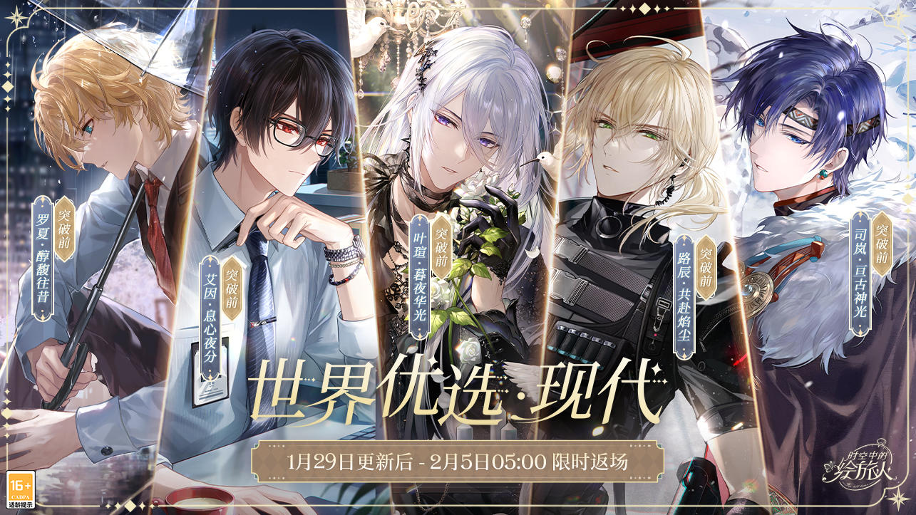 ★1月29日更新后 - 2月5日05:00,[世界优选·现代]画廊限时返场。艾因SSR[息心夜分]、路辰SSR[共赴焰尘]、罗夏SSR[醇馥往昔]、司岚SSR[亘古神光]、叶瑄SSR[暮夜华光]限时开放获取,画廊具备绘制奖励,每名角色绘制奖励互通,绘制次数达160次时可获得对应画廊的[现代礼盒]。► 艾因SSR[息心夜分]在[世界优选·艾因]中概率UP,获取概率提升至占全部SSR画灵的50%,