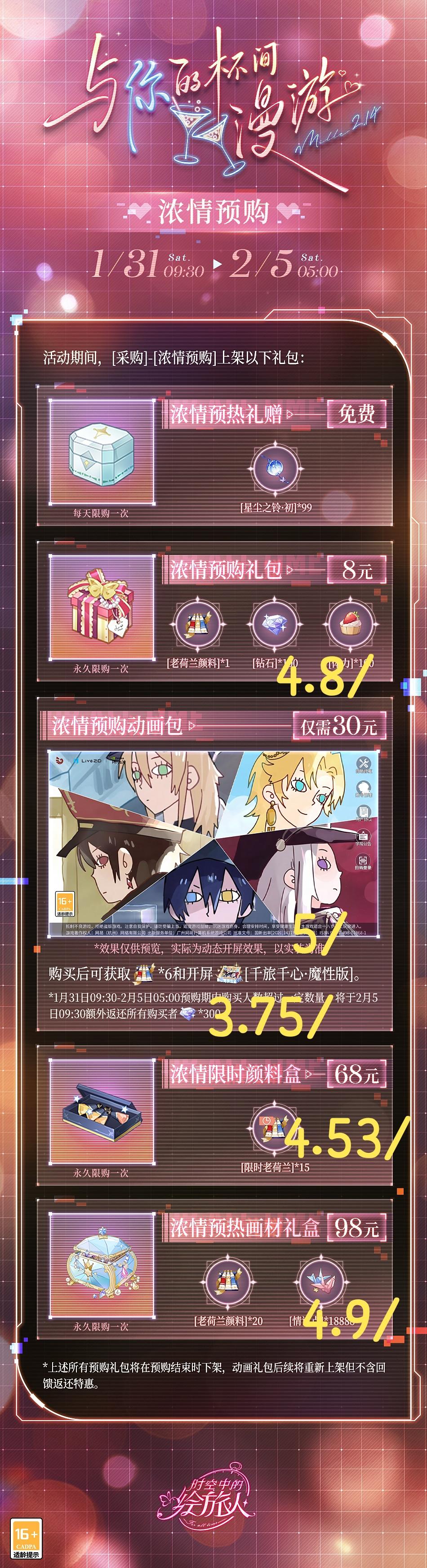★1月31日09:30 - 2月5日05:00,大版本活动「与你的杯间漫游」开启先遣预售,于[采购]-[浓情预购]上架:► 每日可免费领取[浓情预热礼赠]礼包。► 30元[浓情预购动画包],可获得开屏[千旅千心·魔性版]+[老荷兰颜料]*6,购买人数超过一定数字,将在2月5日09:30额外返还所有预购者[钻石]*300。► 特惠预购礼包限时上架。————————————————#时空中的