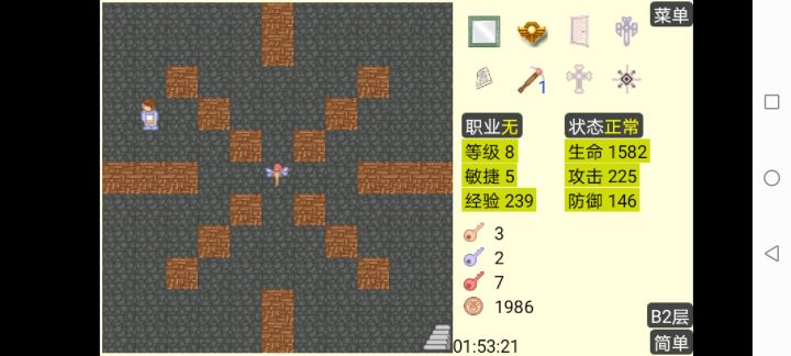 第一次玩带转职的魔塔...按以往看到网上评论,印象从弱职业往强职业体验一周目选的最中间:霸者转职。这个职业不会中毒,衰弱,所以红绿瓶子没用,技能是受伤害能反击...好吧,我也不知道这技能魔塔里这到底有多大用...直接上最终数据图,最后走的假结局。建议前期只加防,打到地下十几层时遇到红色拿剑的盔甲骑士和红色平头怪时,就要把防御升到600~700大约是攻击800左右样子开始点防,印象是这样,记