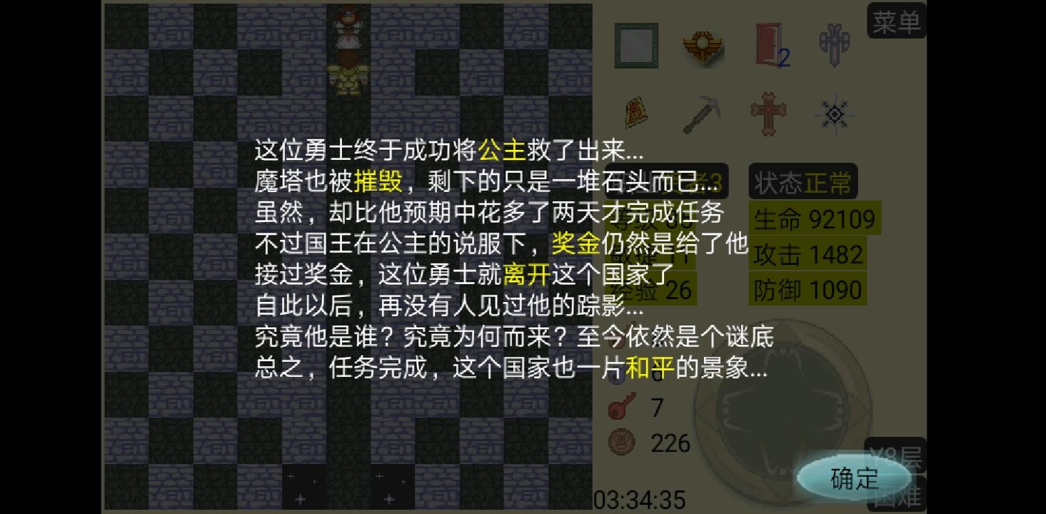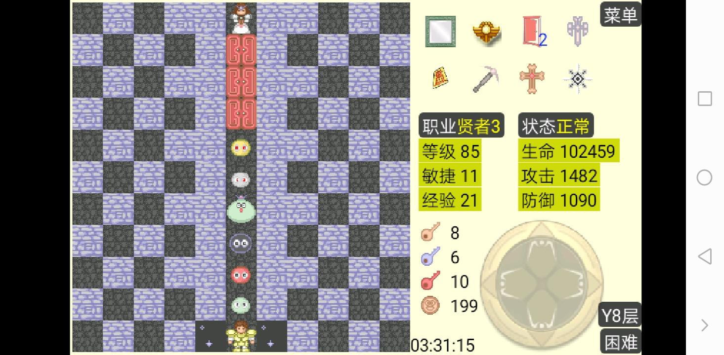第一次玩带转职的魔塔...按以往看到网上评论,印象从弱职业往强职业体验一周目选的最中间:霸者转职。这个职业不会中毒,衰弱,所以红绿瓶子没用,技能是受伤害能反击...好吧,我也不知道这技能魔塔里这到底有多大用...直接上最终数据图,最后走的假结局。建议前期只加防,打到地下十几层时遇到红色拿剑的盔甲骑士和红色平头怪时,就要把防御升到600~700大约是攻击800左右样子开始点防,印象是这样,记
