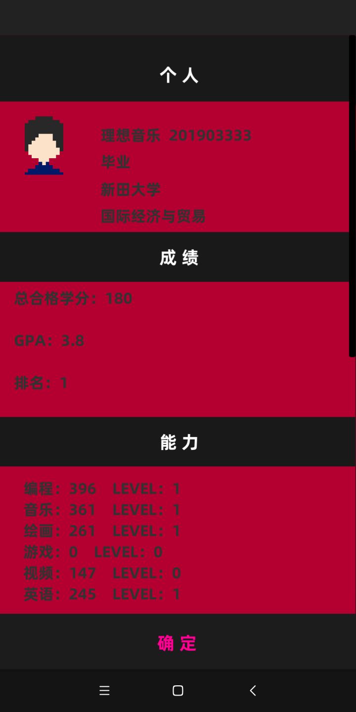 714分毕业,主要这个档是玩一个类似理想的学习状态来选的,游戏中比较有用的是画画,编程,英语,我主修音乐感觉没啥大用处,每个月基本重复度过,刷学习经验值,以及每次放假时必定打工,竞选社团很有用,社长再升一级可以收钱,来钱很快,后面可以买编程和考验书来刷等级,感觉游戏范围很广而不深
