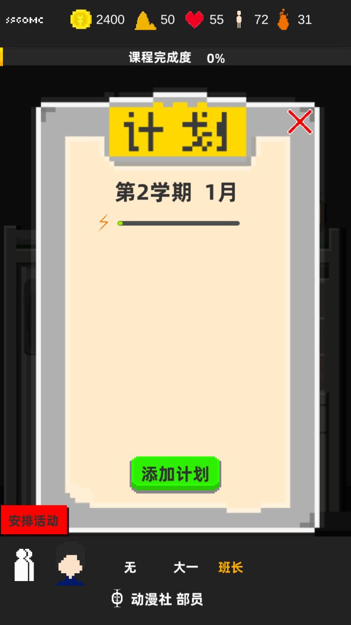714分毕业,主要这个档是玩一个类似理想的学习状态来选的,游戏中比较有用的是画画,编程,英语,我主修音乐感觉没啥大用处,每个月基本重复度过,刷学习经验值,以及每次放假时必定打工,竞选社团很有用,社长再升一级可以收钱,来钱很快,后面可以买编程和考验书来刷等级,感觉游戏范围很广而不深