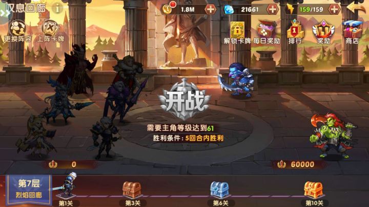 【叹息回廊】叹息回廊为一次性挑战玩法,玩家可按顺序从低层级一路挑战的高层级,每层胜利后即永久通过,每次进入都可接着上次进度继续挑战奖励:1、每层分为普通关卡和特殊关卡,普通关卡胜利后掉落普通道具。特殊关卡胜利后掉落普通道具并额外获得卡牌宝箱,可领取不同卡牌2、每天第一次进入叹息回廊时,根据昨天挑战进度领取奖励,通过层数越高每日奖励越丰厚3、使用叹息回廊专属的“回廊币”可在对应商店换取大量