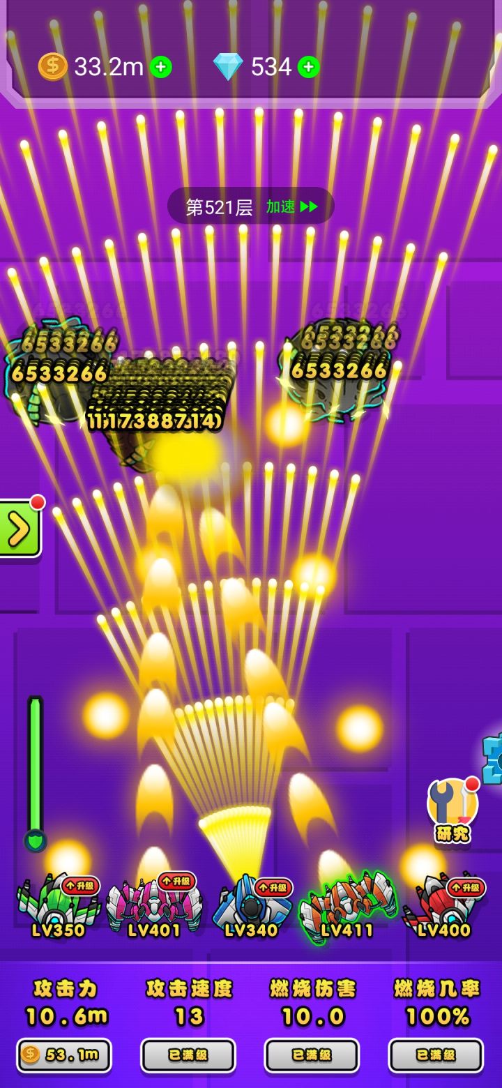 这游戏总的来说就是毫无新意,怪物只有几种,到500多关以后血量厚到跟本打不动。五烈焰很强,推荐使用,但到后期打怪就打不动了,生研究也很有用,但是没有什么太大的用处,怪物仍旧打不动