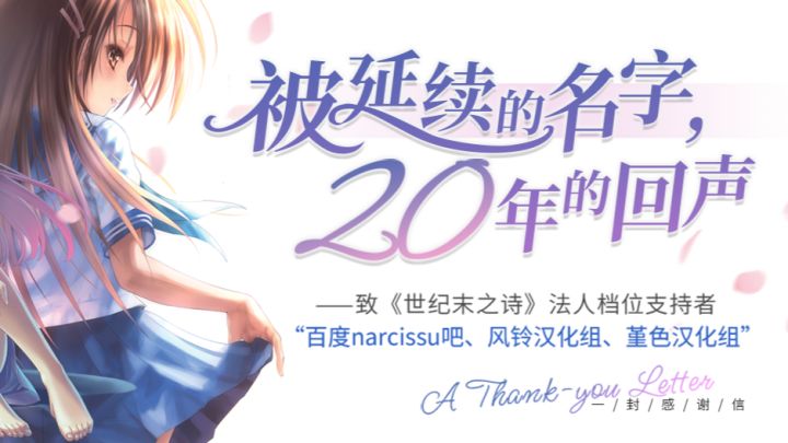 ——致《世纪末之诗》法人档位支持者“百度narcissu吧、风铃汉化组、堇色汉化组” 这是一封迟到了两个月的感谢信。最初,我们一直在纠结——如何选择合适的方式、精确的措辞与恰当的立场;又或者,是否应该选择回绝。转眼之间,支持金额已然来到80万。我们忽然意识到:或许这份感谢,并不属于某一个时间节点。也许迟到已久,也许无论何时说起,都不算太晚。我们所面对的,是横跨二十年的喜欢与守望,也