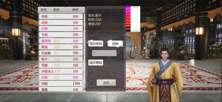 首先每个人物都有以上五个值。 需求值满了就会持续增加野心值,野心值满了就会持续掉亲密度。 1.合适的俸禄可以长期抑制增长官员的需求值和野心值的增长,每个官员的需求值和野心值各不相同。 2.建立亲密关系官员的需求会下降75%,门客也算。 3.赏赐会一次性的提高亲密度。 4.投其所好满足需求,也会大幅的抵消官员的需求值。 5.有的官员天生需求就很高,要满足需要花费大量时间和精力。 6.有的官员拥有忠义