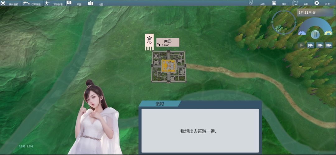 战争 战斗方式是六边格的世界回合制,玩家有充分的时间来思考排兵布阵。 下面先演示部分基础兵法。(游戏里的兵法会更多) 夜袭 夜晚对正在休息敌人发动袭击,可以使敌人短暂陷入混乱的状态并造成大量伤亡。将领的武力值会影响伤亡数量。 伏兵 在敌人的视野外,预判敌人的行军路线。寻找掩体设下伏兵,等待敌人靠近进行伏击。 伏击会造成敌人长时间的混乱,和大量的伤亡。 将领的智力值会影响伤亡数量。掩体的选择受将领的