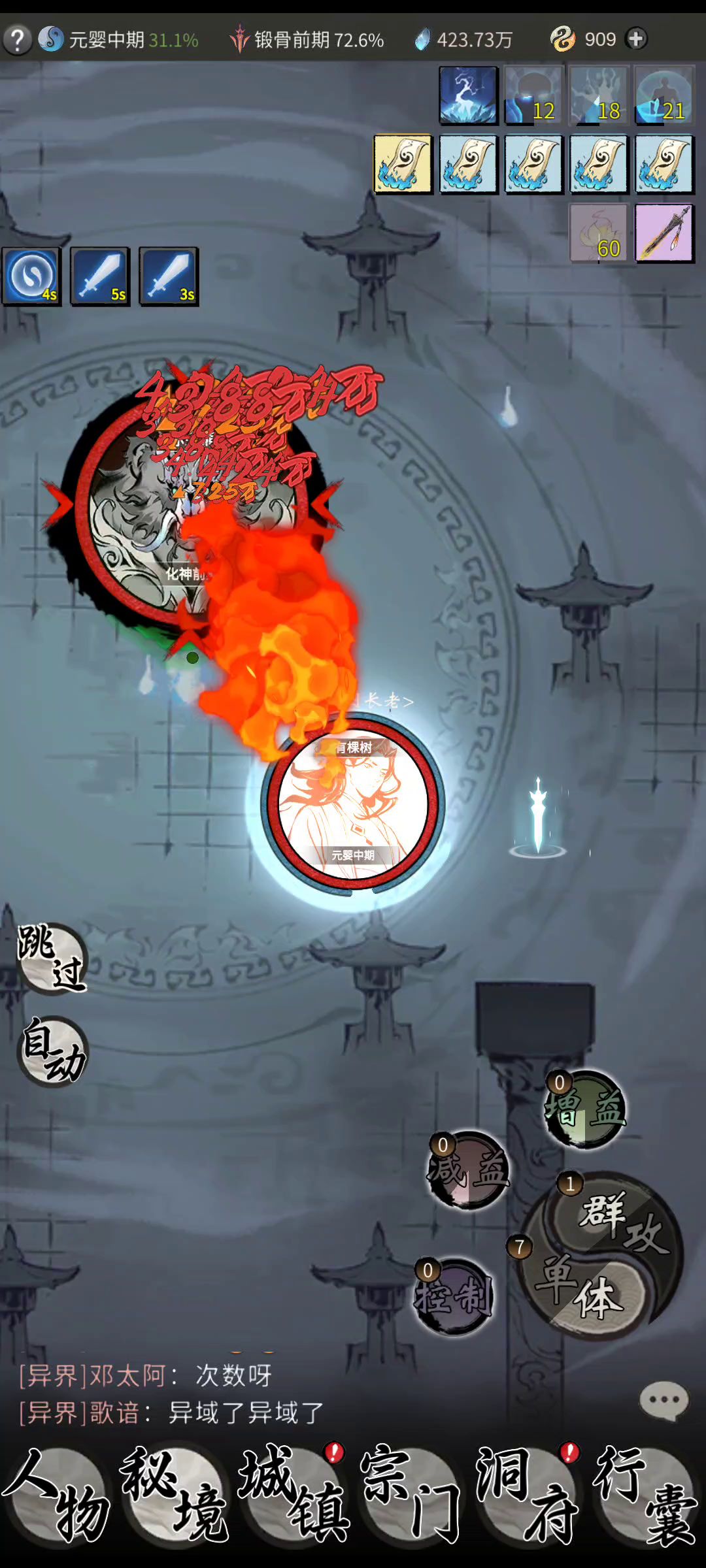 (1)起手:冰符(控制)+伤害*1(推荐火焰刀,有持续伤害可以减少Boss脱战时间)+冰剑(控制)+伤害*2(个人面板里伤害最高的两个法宝) 迅速后撤开始风筝(绕场跑)