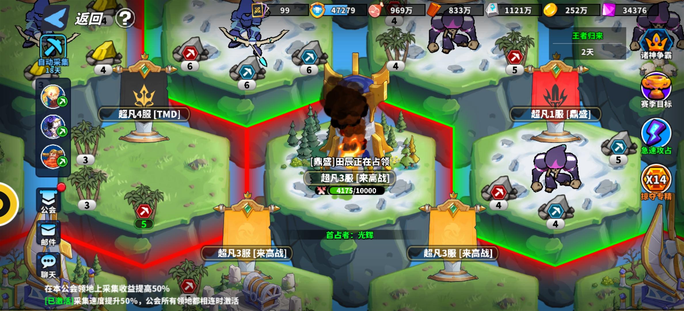 关于能量的说明:能量决定了我们的战力增幅而能带多少能量是根据上场角色星级决定的,上场角色星级越高能带的能量就越高一 .赛季目标一共4种赛季目标,国王奖励,战斗大师采集目标和恶魔目标,如果你是区内第一公会的会长直接就是国王奖励,其余只建议拿战斗大师二.杀敌很多人不清楚怎么获取杀敌,有两种方法可以获得杀敌1.通过空岛地盘抢夺夺旗来进行获得,具体如图二这种冒火的海岛说明正在进行夺旗占领在倒计