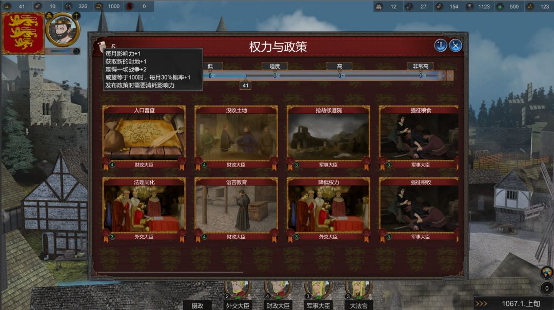 政策目前通用政策19个包含了 人口普查 法理同化 没收土地 语言教育 抢劫修道院 降低权力 强征粮食 强征税收 促进稳定 提升情报网 申明封臣义务 提高正统性 文化传播 宗教传播 降低腐败 普招骑士 大兴土木 骑士竞技 肃清阴谋 除了通用政策之外,还有一些不同文化和国家的特有政策会显示在其中 每一项政策颁布都需要花费政治影响力,这里简称为影响力 同时,政策的发