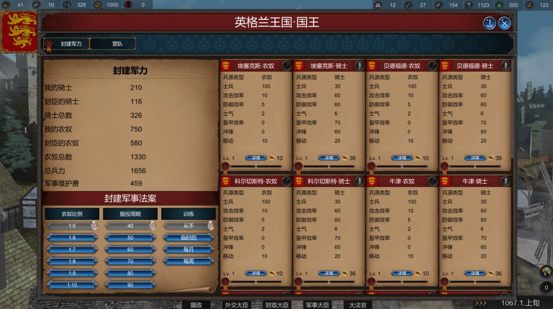 封建部队 领主的每一个直辖封地,都会拥有两支封建营队,一支为骑士部队,一支为农奴部队农奴部队的构成由封地的骑士数量与农奴的服役法案决定游戏开局默认1个骑士伴随着5名农奴参加战争修改服役法案后最高会增加到10一些文化或者国家的修正还可以增加这个人数每一支部队在战场上都是独立的存在 军事法案 农奴比例决定了1名骑士将由多少名农奴伴随一起出征 服役周期决定了多少天后封建部队才会产生维护费用,在这期间没有