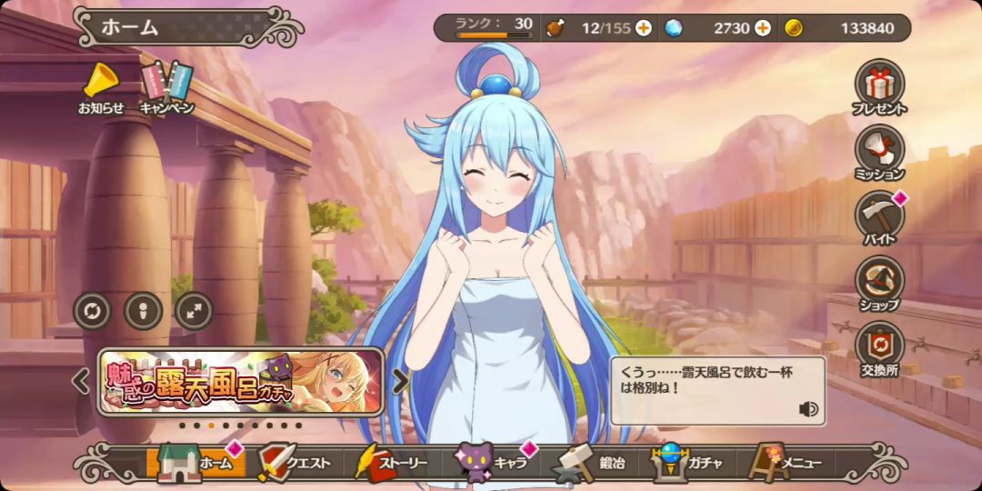 0氪 30级了 满欧的,4星有12个了。阿库娅给了4个。没赶上惠惠的副本有点可惜(惠惠只打了几天)彩武器挺难搞的。biubiu加速器可以进去,游戏在Qooapp里下载的不用谷歌也可以玩,挂biubiu,ps氪不了金。美しい世界に祝福を捧げる