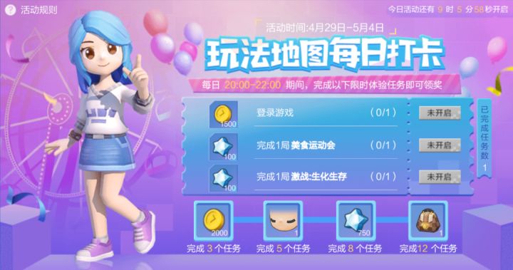 亲爱的冒险家们今天是开测的第二天大家的家园星球建设得如何了?如果累了的话不妨去匹配大厅放松一下玩法地图的限定活动也已经开启超多奖励等你来领!活动内容活动时间4月29日——5月4日活动内容1、每日20:00-22:00,玩家登录游戏或游戏在线则视为完成任务,可领取当日奖励。2、活动期间,每日会刷新特定2款玩法地图。每日20:00-22:00,玩家在任意特定玩法地图中完成一局则