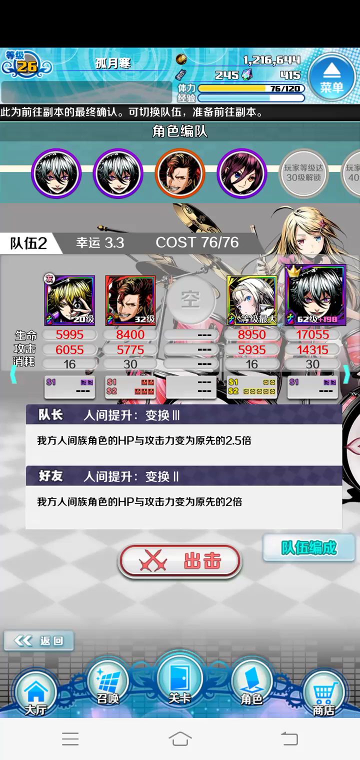 反应慢,手速慢,还忘了点技能,我真的是好弱,等都喂满再升点cost以后我再试试,或者用闪闪洛基队试试不过人间队应该稳点
