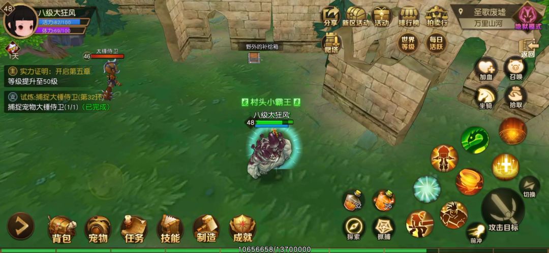 原本只是想速刷一波Boss的,没想到在半路偶遇了心心念念的变异宠物,果断拿着为数不多的金币买了几个捕捉绳去准备把它拿下,过程中经历了两次失败的信息,让我心里很是担心,平时捉普通宠物两次就已经吓跑了,没想到变异宠物的心态如此之好一点事都没有,后面心想可能是血太多了不好抓,就用一技能加普攻磨血,最后孤注一掷直接拿下了,很是开心,希望大家也能有好运抓到自己喜欢的宠物哦。酷[表情_酷]