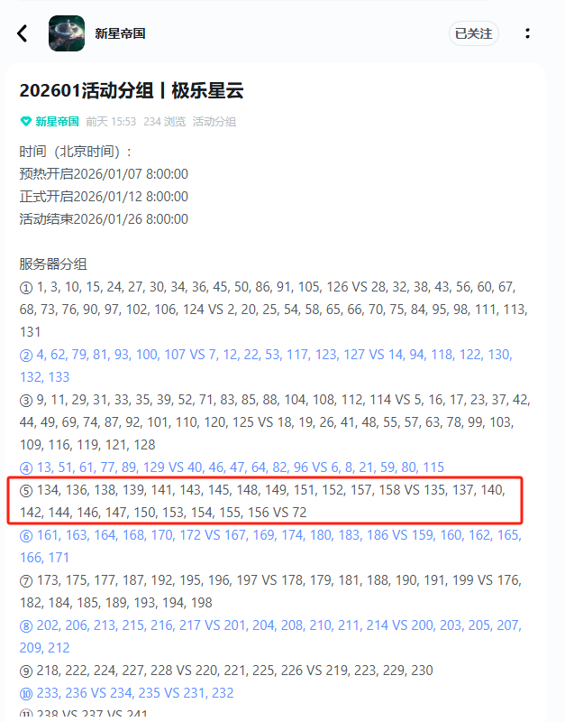 炽焰战场2025/1/12 8:00243 vs 244 vs 245246 vs 247 vs 248极域战区2026/1/12 8:00257258261262天幕2026/1/12 8:00259260#活动分组