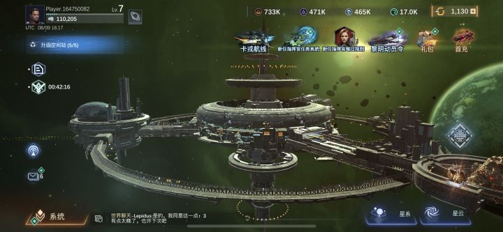 1.开局,指挥官Lv1-10 跟着主线任务快速升到指挥官10级,再将空间站升到10级,这时候建筑的等级不再追随指挥官等级,只要你资源够,那建筑可以一直升,但是在升建筑前,我们先在科研中心-空间站科研线-科研“机械工程系统”,这样可以节省一些建筑升级消耗。前期如果有充足合金,完全可以凭升建筑达到很高战力,而且这是前期提升成员战力,提升联盟排名的重要途径,盟主也可以督促成员积极升建筑,这样前期联盟