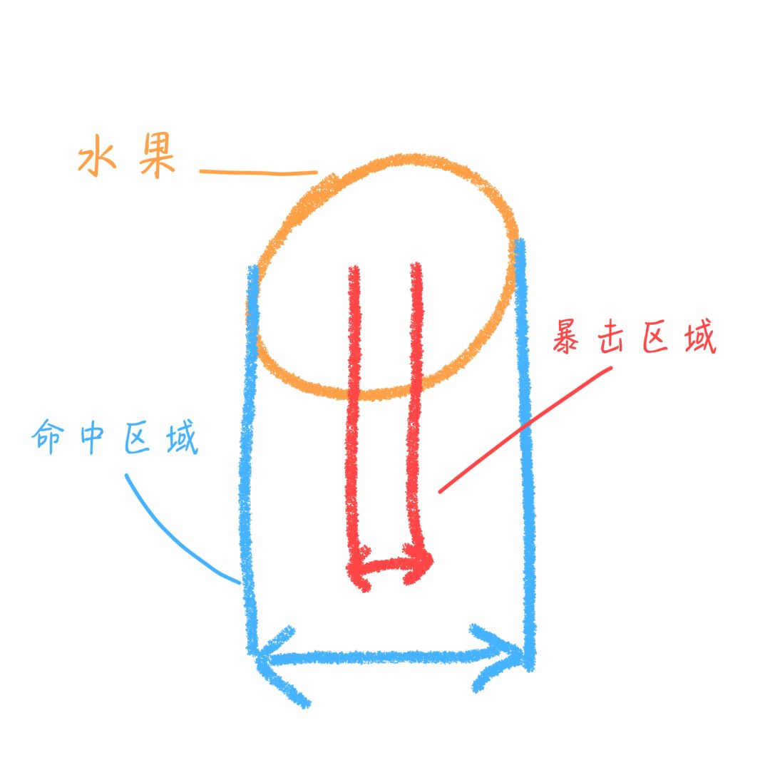 如图,每个水果根据大小有一个命中区域,刀子打在命中区域内判定为切到。同时有一个更小的暴击区域,刀子打在这个区域内判定为暴击。 其实就是看你打得准不准。 水果落到低处更容易打出暴击,因为离出刀的地方近,方便判断位置。另外水果垂直下落的时候出刀也比较容易打出暴击。 #切切