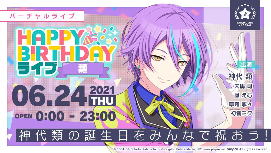 🎡6月24日是神代类的生日👑 北京时间6月23日23:00起举办「HAPPY BIRTHDAY LIVE 类」虚拟演唱会🎂 虚拟商店也会销售期间限定商品🎁 此外,参加本次虚拟演唱会还可以获得限定称号✨敬请期待🌈 ※限定商品・称号有再登场的可能性 ※详细信息请在游戏内查看 #初音未来# #世界计划 多彩舞台# #神代类# #神代類# (已获得b站projectsekai资讯站授权)
