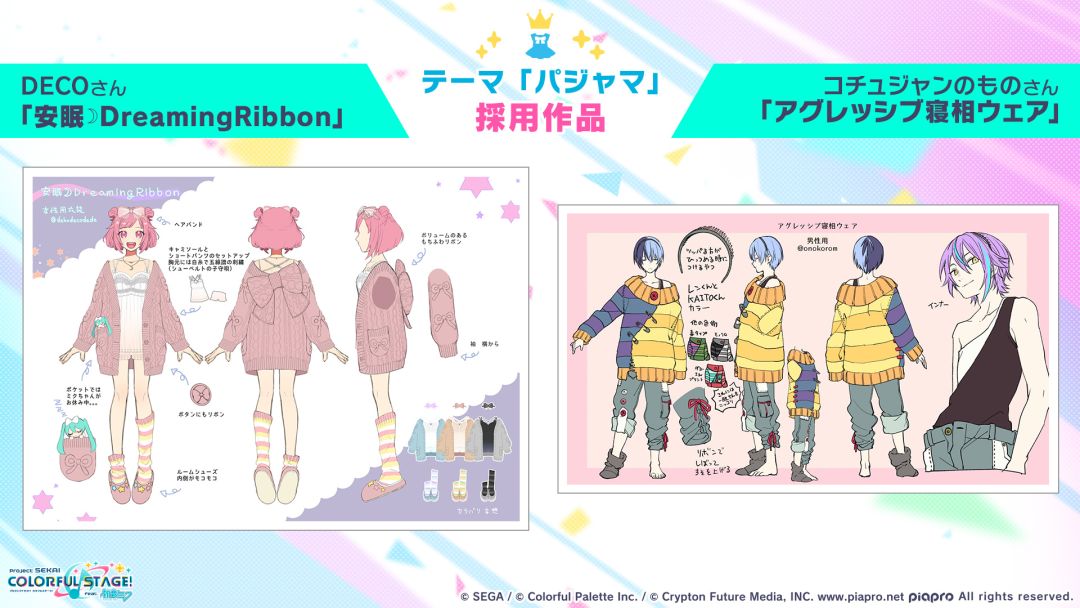 🎨第7回服装设计征集活动结果公布: 服装征集主题「睡衣」🌙 🎊采用作品: 「安眠☽DreamingRibbon」- DECO (注释:不是DECO*27) 「アグレッシブ寝相ウェア」- コチュジャンのもの (预定于2021年9月实装) 🌟官方选出的未采用佳作: 女装: 「Drop into セカイ」- にんじん 「ウェルカムファンタジー」- まぐ(magu.) 男装: 「おやすみくまさん」- 史楼