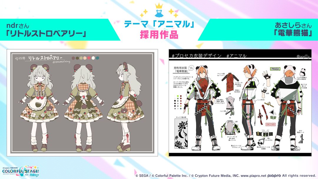 🎨第6回服装设计征集活动结果公布: 服装征集主题「动物」 🎊采用作品: 「リトルストロベアリー」- ndr 「電華熊猫」- あさしら (预定于2021年8月实装) 🌟官方选出的未采用佳作: 女装: 「森の郵便屋さん」- はると 「ふぉっくすくーる」- 中古アンプ 男装: 「パッチワーク・ベア」- へいわ 「がおがおダイナソー!」- なしこ #初音未来# #世界计划 多彩舞台# (已获得b站pro
