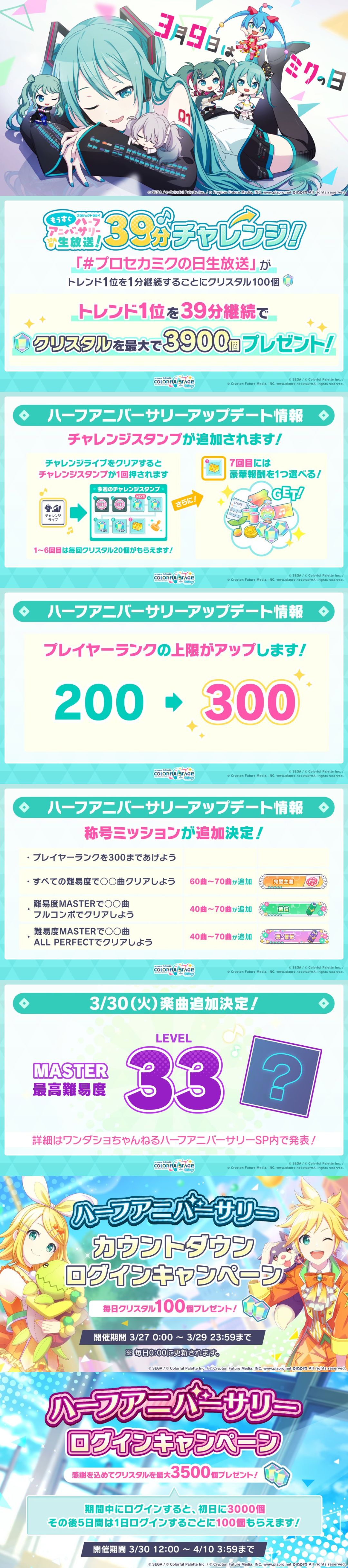 『世界计划多彩舞台 马上迎来半周年纪念直播』 情报汇总 1.39分钟挑战活动,在直播开始39分钟内每达成一分钟的推特话题热度榜首就可以获得「水晶×100」,最多可以获得「水晶×3900」。【已完成】 2.每日挑战演出追加挑战集点机制,完成每日挑战演出可以获得追加奖励,前六天每天可获得「水晶×20」,第七天可以在各项奖励中选择一项获得。 3.玩家等级上限从200提升至300。 4.称号目标增加,包括