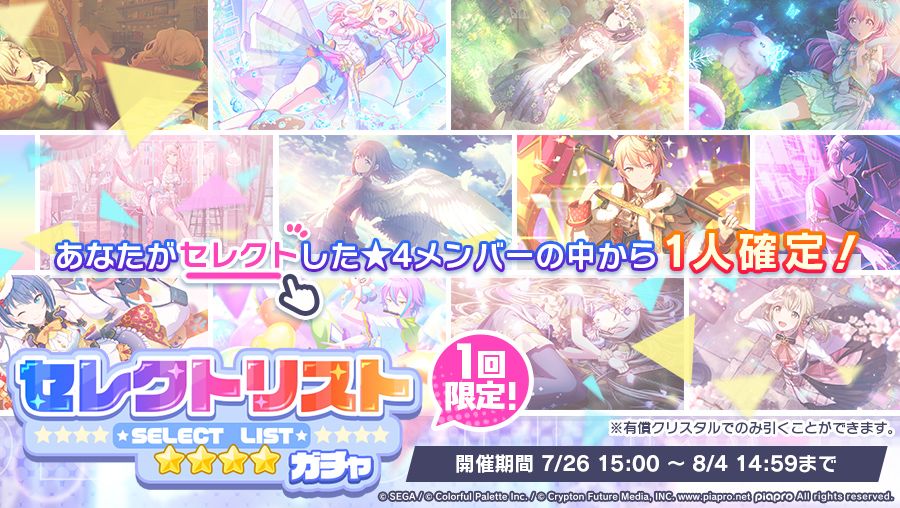 北京时间明天 (7月26日) 14时开始 🌟Select List招募🌟开启🎊 在选择列表中选择10名★4成员,将会必得其中1名🌈 ※需使用「有偿水晶×3000」进行,一人仅限一次 ※可选的招募成员范围:截止到『虹色和声(Harmony)』招募 (第二十七期活动) 的常驻★4成员 (已获得b站projectsekai资讯站授权)