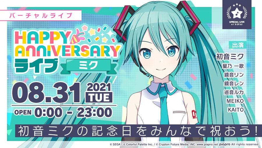 🎤8月31日是初音未来14周年🎶 北京时间8月30日23:00起举办「HAPPY ANNIVERSARY LIVE MIKU」虚拟演唱会🎂 虚拟商店也会销售期间限定商品🎁 此外,参加本次虚拟演唱会还可以获得限定称号✨敬请期待🌈 ※限定商品・称号有再登场的可能性 ※详细信息请在游戏内查看 (已获得b站projectsekai资讯站授权) (快开学了,快乐的时间也要结束了)