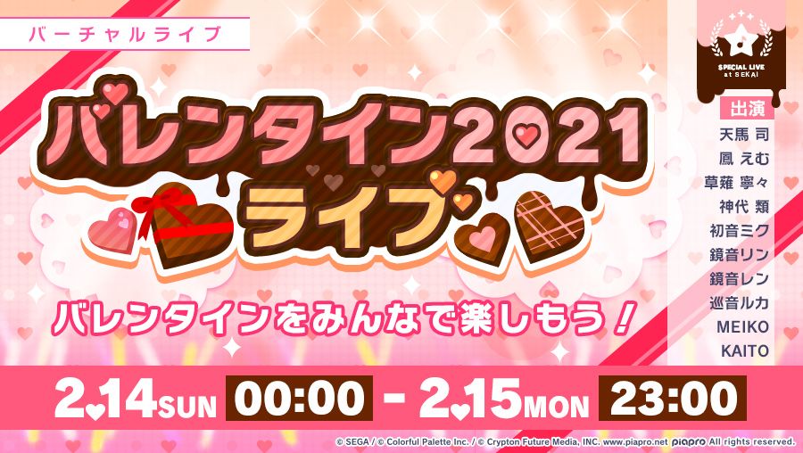 💝情人节2021 虚拟演唱会💞 将在北京时间2月13日23:00开始举办 虚拟商店也会销售期间限定商品🎁 此外,参加本虚拟演唱会还可以获得限定称号✨敬请期待🌈 ※期间限定商品・称号有再登场的可能性 💝情人节登录活动举办决定💞 情人节当天登录游戏即可获得「情人节巧克力×1」「水晶×300」🎁 ※详细信息请在游戏内查看 #初音未来# #世界计划 多彩舞台# 【消息转载自b站project sekai