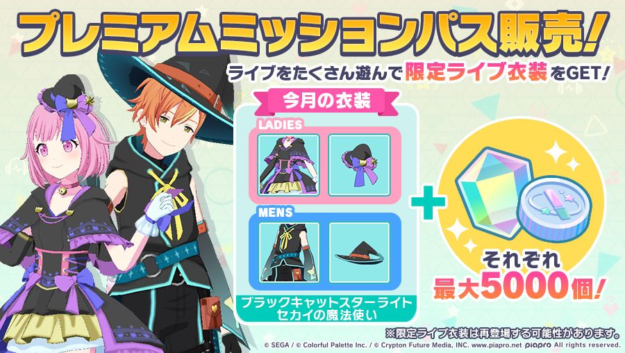 5月的「Premium Mission Pass(大月卡)」售卖中✨ 本月的LIVE服装采用自第3回服装征集活动「魔法」篇中桃タルトさん和てんさん的作品👗 从本月开始大月卡达到25pt就可以获得限定服装的原版颜色👔 (之前需要达到5000pt才可获得) #初音未来# #世界计划 多彩舞台# (已获得b站projectsekai资讯站授权)
