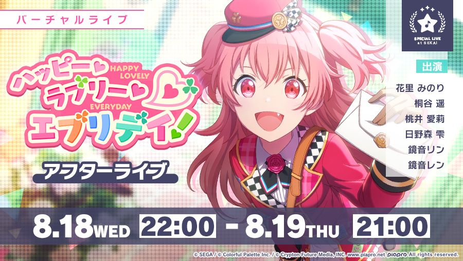 💕第三十一期活动『Happy Lovely Everyday!』 After Live 虚拟演唱会🎤 将于北京时间8月18日21时起开始✨ 虚拟商店也会销售新商品🎁 此外,参加该虚拟演唱会还可以获得表情贴纸✨敬请期待🌈 (已获得b站projectsekai资讯站授权)