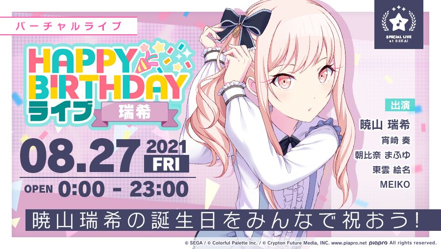 🎧8月27日是晓山瑞希的生日🎤 北京时间8月26日23:00起举办「HAPPY BIRTHDAY LIVE 瑞希」虚拟演唱会🎂 虚拟商店也会销售期间限定商品🎁 此外,参加本次虚拟演唱会还可以获得限定称号✨敬请期待🌈 ※限定商品・称号有再登场的可能性 ※详细信息请在游戏内查看 同人站举办的应援投稿活动:https://t.bilibili.com/562794862158214577 (已获得b站p
