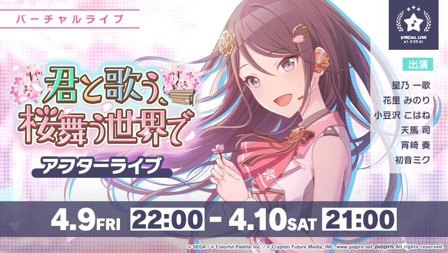 🌸第十八期活动『与你一同歌唱,在樱花飞舞的世界中』 After Live 虚拟演唱会🎤 将于北京时间4月9日21时起开始✨ 虚拟商店也会销售新商品🎁 此外,参加该虚拟演唱会还可以获得表情贴纸✨敬请期待🌈 #初音未来# #世界计划 多彩舞台# (已获得b站projectsekai资讯站授权)