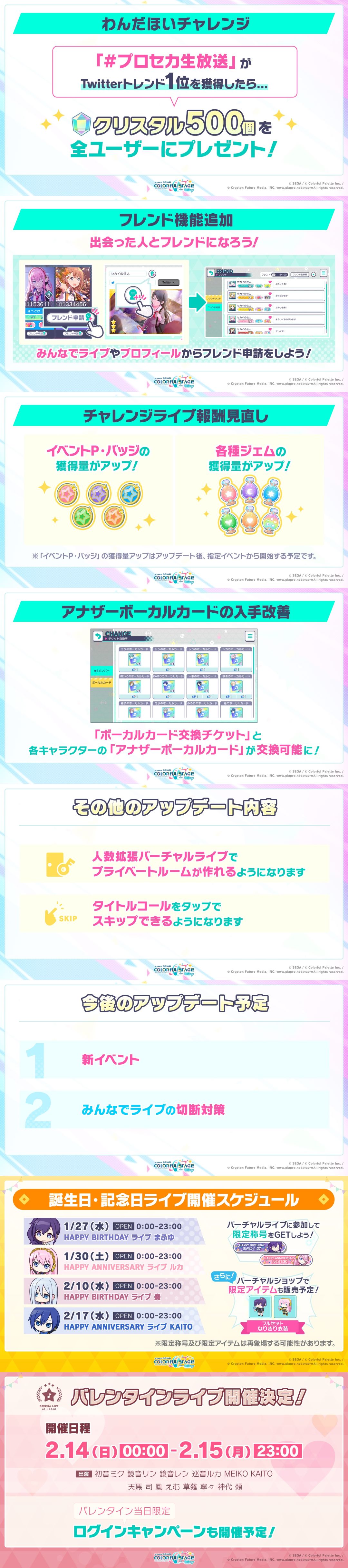 本回直播情报(一) 1.【#プロセカ生放送#】tag推特趋势排名1位奖励「水晶×500」 2.好友功能实装 3.每日挑战live奖励量增加 4.新增角色音源卡兑换券(组合/个人用) 5.虚拟演出人数上限正式变为100人 6.游戏启动界面的语音可点击跳过 7.后续将推出新活动形式和针对协力演出切断的对策 8.朝比奈真冬、巡音流歌、宵崎奏、KAITO的生日/周年纪念日虚拟演唱会举办决定 9.2月14日