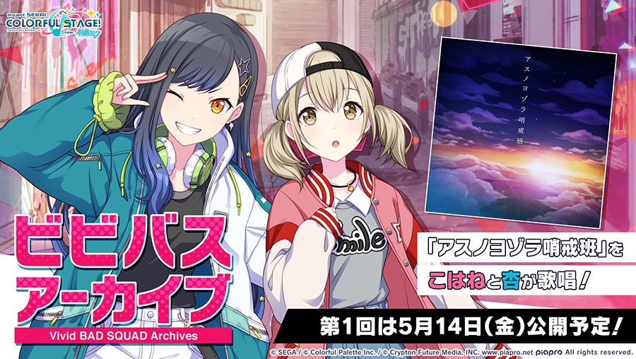 💿Vivid BAD SQUAD Archives 5月14日公开决定🌟 由小豆泽心羽和白石杏演唱的『アスノヨゾラ哨戒班』 将在北京时间5月14日17:00公开 #初音未来# #世界计划 多彩舞台# #Vivid BAD SQUAD# (已获得b站projectsekai资讯站授权)
