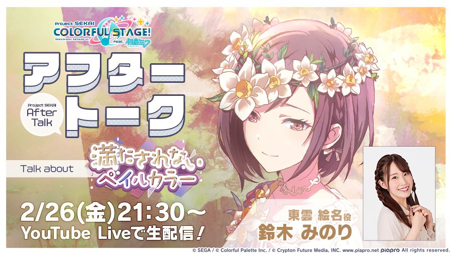 💭世界计划 After Talk 『无法填满的淡色』篇🎨 与铃木实里 (东云绘名 役) 一起回顾『无法填满的淡色』活动📺 活动结束后,北京时间2月26日20:30在油管直播该节目✨ 链接:https://youtu.be/n0zwWXZ4WLs #初音未来# #世界计划 多彩舞台# #铃木实里# 【消息转载自b站project sekai资讯站,已授权】