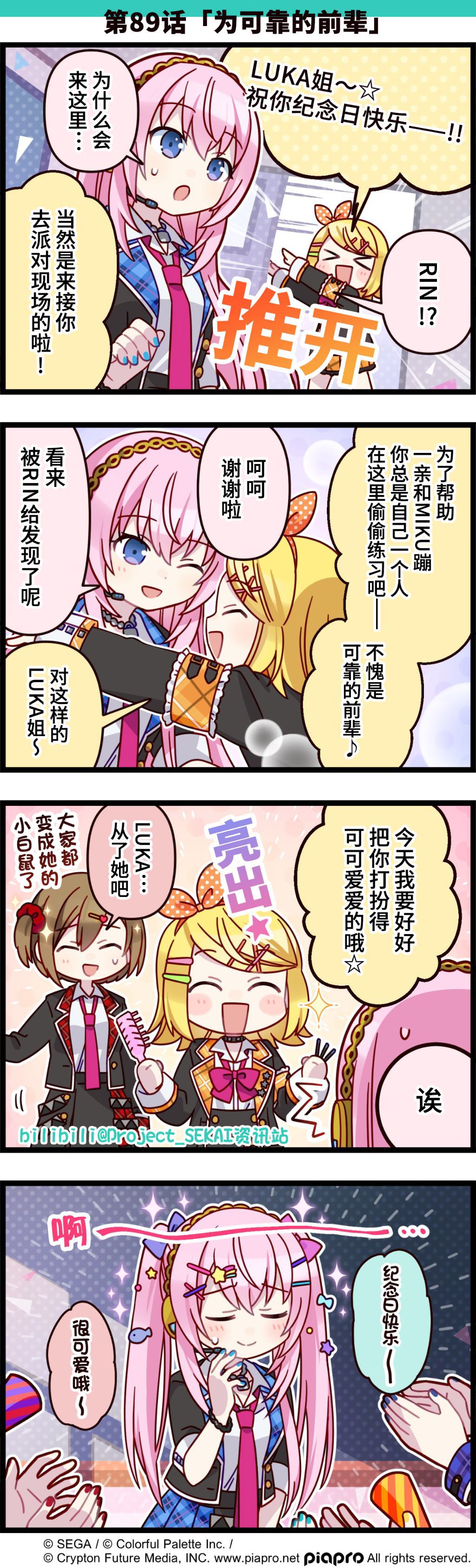 描绘《世界计划》日常的四格漫画公开✨ 第89话「为可靠的前辈」 纪念日快乐,LUKA! 作为今天的主角,一定要打扮得漂漂亮亮的哦 翻译:Mizora@未穹-Che-Mizora 校对:弃子@棄子 嵌字:长星@nagahoshi (已获得b站projectsekai资讯站授权)
