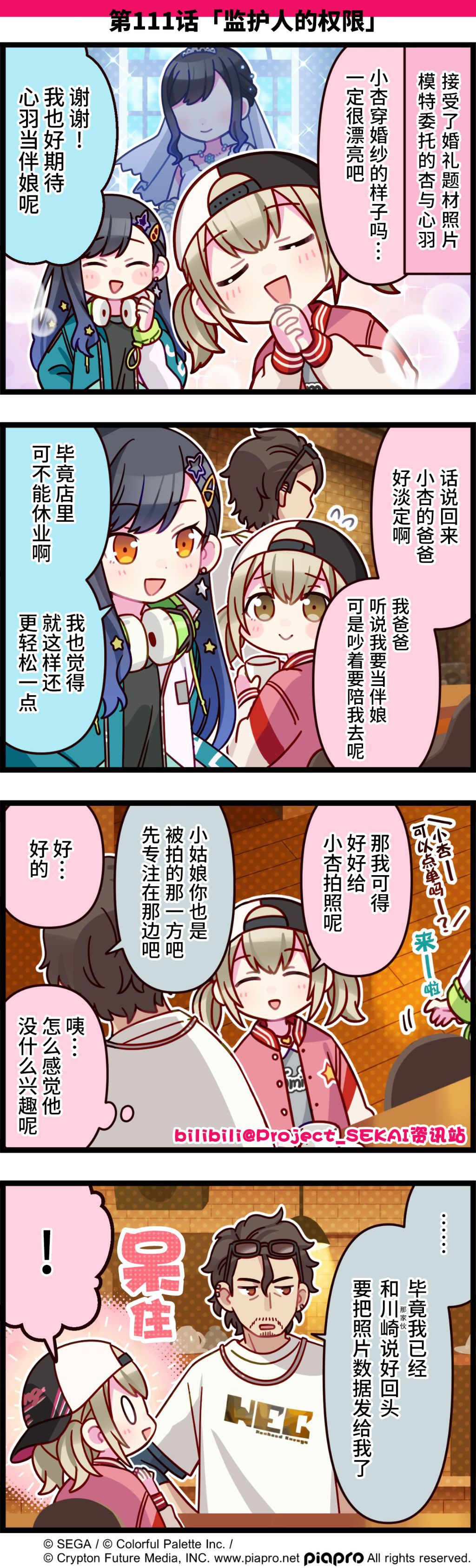 描绘《世界计划》日常的四格漫画公开✨ 第111话「监护人的权限」 对于女儿要去当婚纱模特这件事,谦叔似乎相当淡定…… 翻译:Mizora@未穹-Che-Mizora 校对:破壳@pokemonch 嵌字:长星@nagahoshi (已获得b站projectsekai资讯站授权)