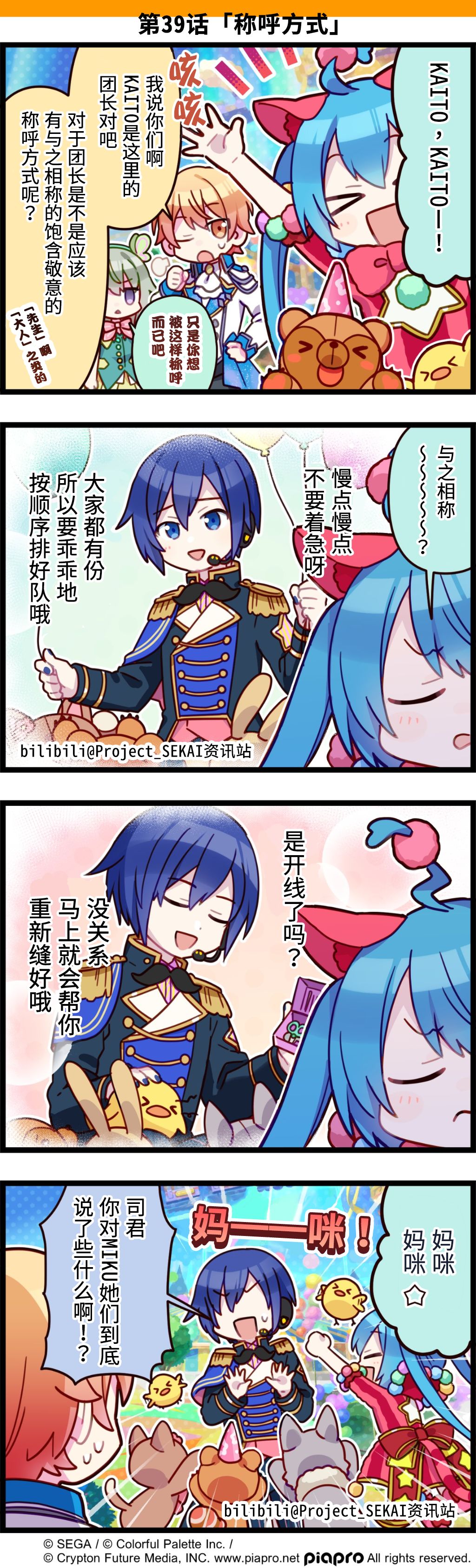 描绘《世界计划》日常的四格漫画公开✨ 第39话「称呼方式」 奇幻仙境温柔的团长KAITO永远是大家最好的妈妈!! 翻译:isaki@Isaki_Kirise 校对:未穹@孤門Mizora_Nexusty 嵌字:HatsuneEvn @HatsuneEvn #SEKAI四格漫画# #初音未来# #世界计划 多彩舞台##KAITO# #天马司# #Wonderlands×Showtime# (已获得