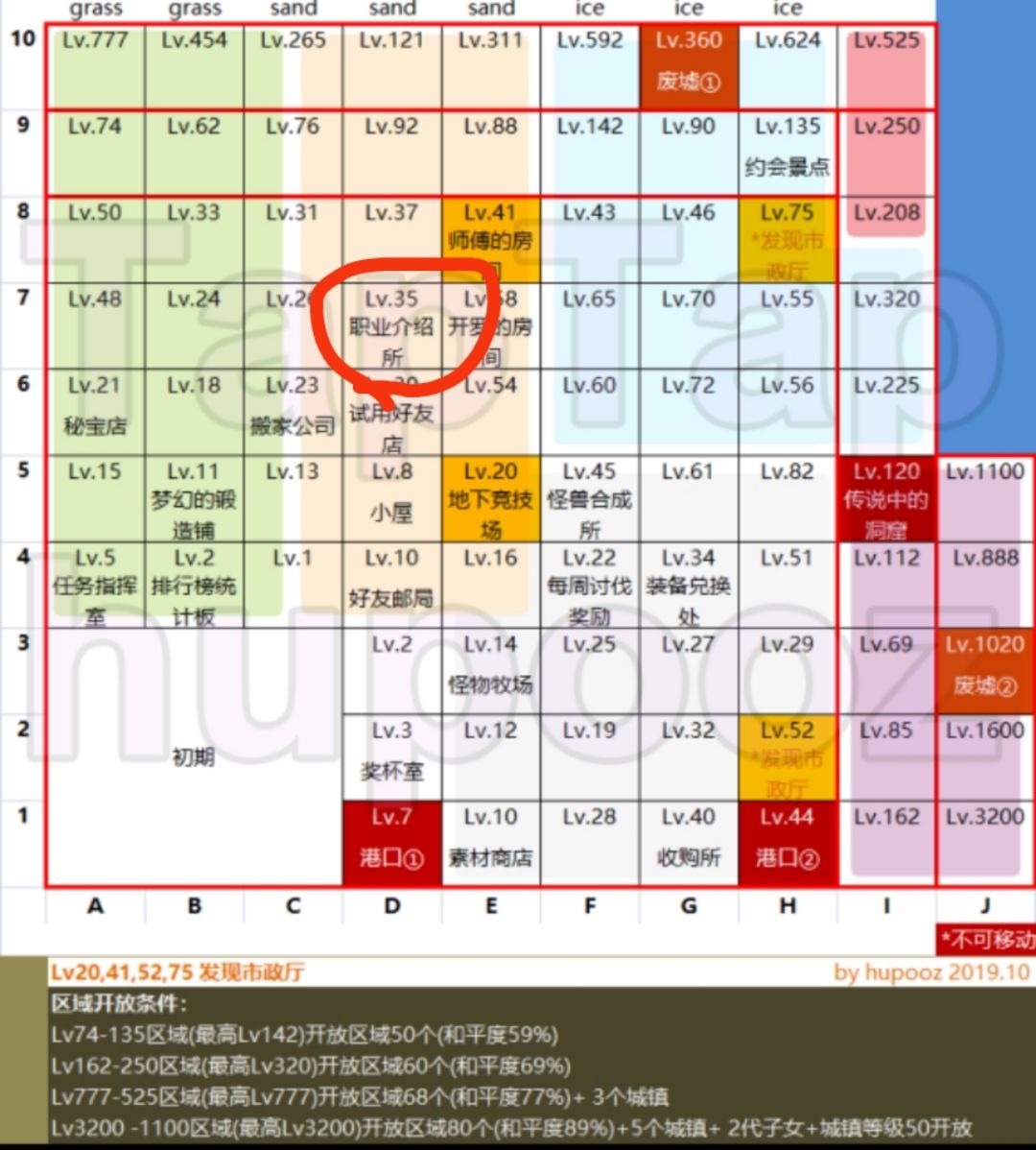 1.区域开放条件 Lv74-135区域(最高Lv142):开放区域50个(和平度59%) Lv162-250区域(最高Lv320):开放区域60个(和平度69%) Lv777-525区域(最高Lv777):开放区域68个(和平度77%)+3个城镇 Lv3200 -1100区域(最高Lv3200):开放区域80个(和平度89%)+5个城镇+2代子女+城镇等级50开放 2.地图 词条解释: 港(可升级