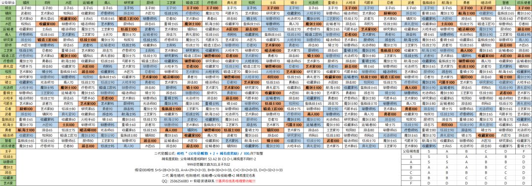 我服啦我服啦,哪个一天天催我做这个的!!!下次你们催我……我还会乖乖做的! 好了萌新老爷们,请看如下注释: 🔥🔥父母间不同的职业搭配有着不同的相性等级,等级越高所生下孩子的觉醒次数也就越高。 而B级及以下相性的父母所生出的孩子觉醒次数会有相应的减少。所以图中黄色高亮部分就是A的契合度。 🔥🔥简而言之:逮着高亮的杂交就行了!别的别养! ⭐生孩子的要点: ①提高亲密度:男女角色通过住在同一间房间来提高